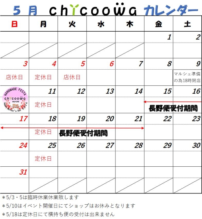 | 2026.04.12 | chicoowa marché Happy Mother's Day 2026に関する情報をUPしました |