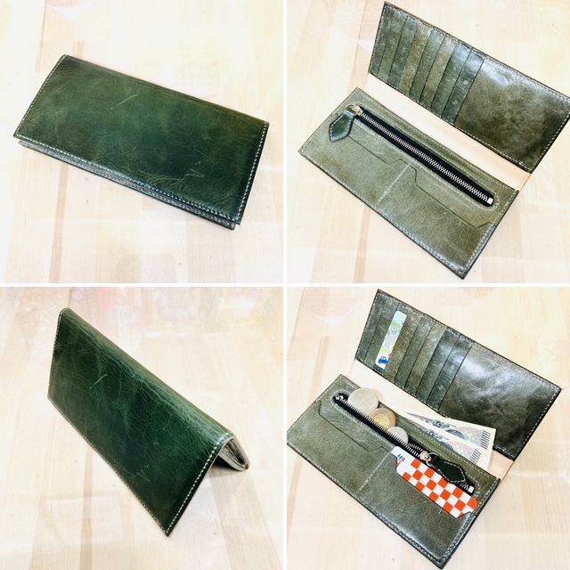 2024年春に完成したショルダーバッグ。実は型紙作成と革の切り出しは10年近く前に済んでいたんですけどchicoowaのオープンとかで忙しくなり長期間放置していた物をやっと仕上げた感じです。こちらも店内で展示中!お財布①