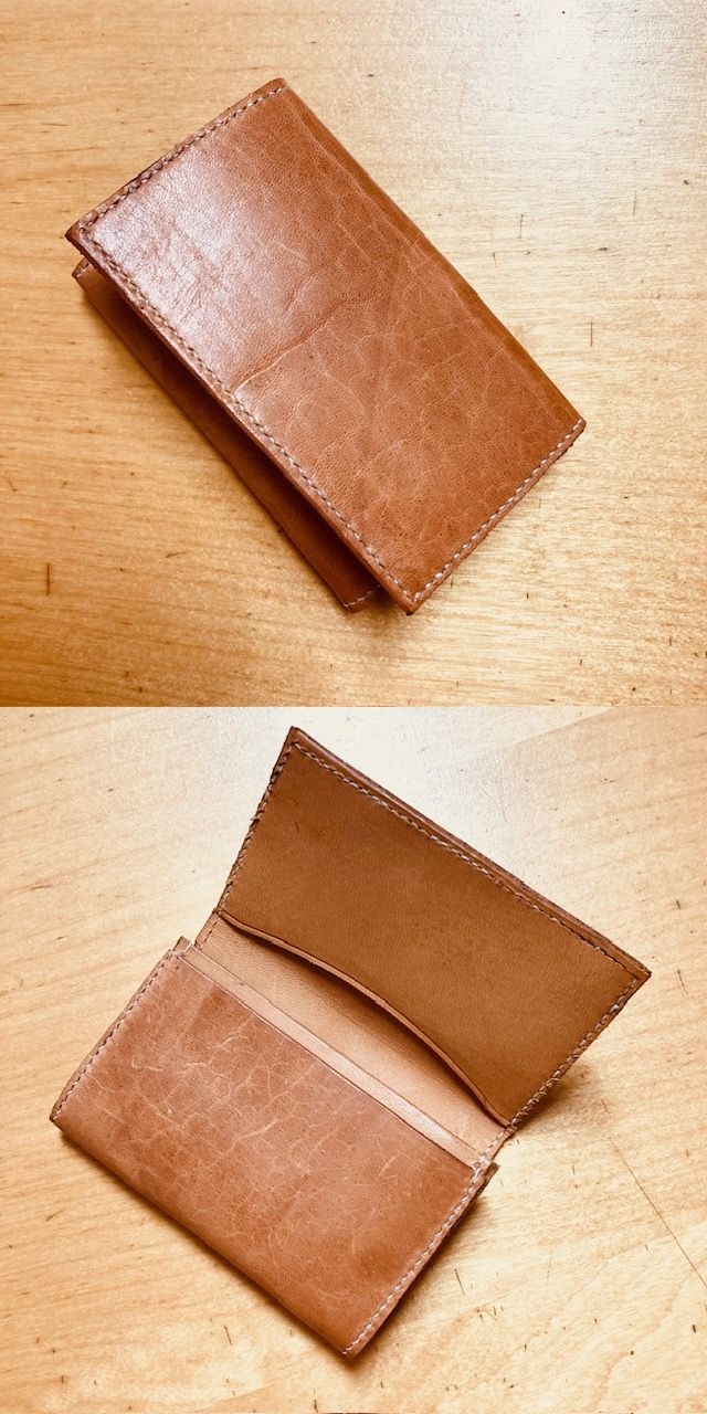 二つ折り財布ですが上のコードバンの物とは小銭入れの形状が違います。こちらの方がガバっと開くので小銭が探しやすい仕様になってます。でも今はスマホ決済とかで小銭はあまり持ち歩かないですよね(^^; こちらも店内のアトリエに展示中です名刺入れ・パスケース